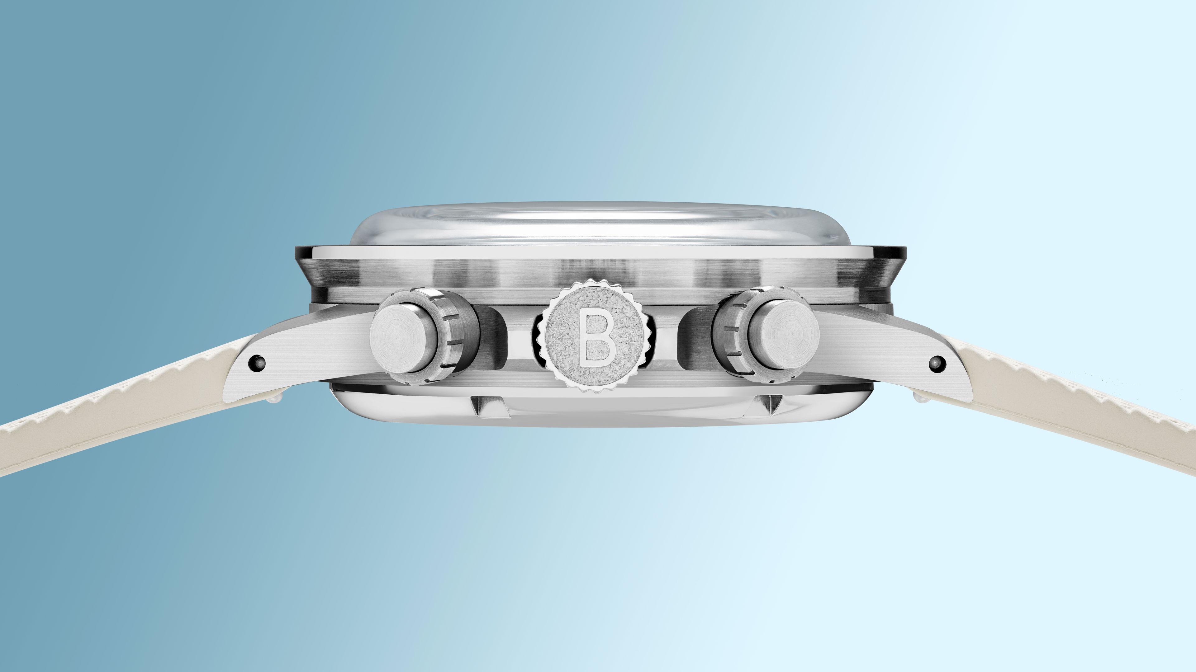 Le cadran de cette édition spéciale est habillé d’un élégant champagne métallisé, contrastant avec les sous compteurs cerclés. Ces derniers font écho aux index concentriques, tout en apportant du volume à l’ensemble. Les aiguilles, d’un orange vif, facilitent la lisibilité en conditions de course. Présentant l’une de ces aiguilles, le sous-compteur « Big Eye » ne laisse pas indifférent. Azuré et gradué à rebours sur 15 minutes, il permet au skipper de maîtriser le départ de sa régate.